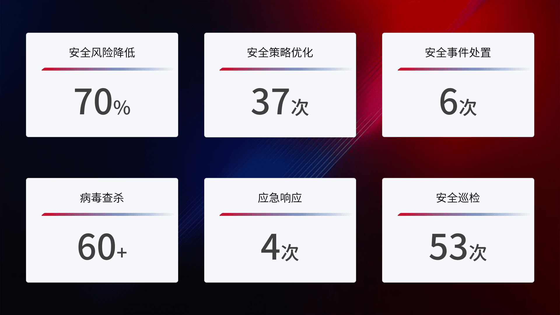 提供全面的安全事件报告体系,,,,包括处置报告、、周报、、、季度和年度总结,,,结合持续监控,,,,帮助客户深入了解网络安全状况。。。